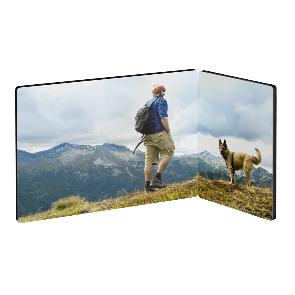 Der zweiteilige Fotoaufsteller mit rechter Seitenausrichtung (27 x 13 cm) bietet eine besondere Bühne für deine Bilder. Zwei verbundene Holzfaserplatten schaffen durch das Scharnier eine kreative Panoramaansicht.